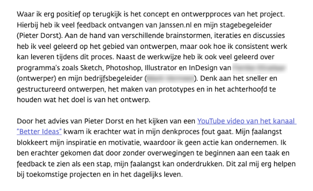 Student verwerkt feedback die gaat over grondigheid (brainstormen, iteraties en discussie).